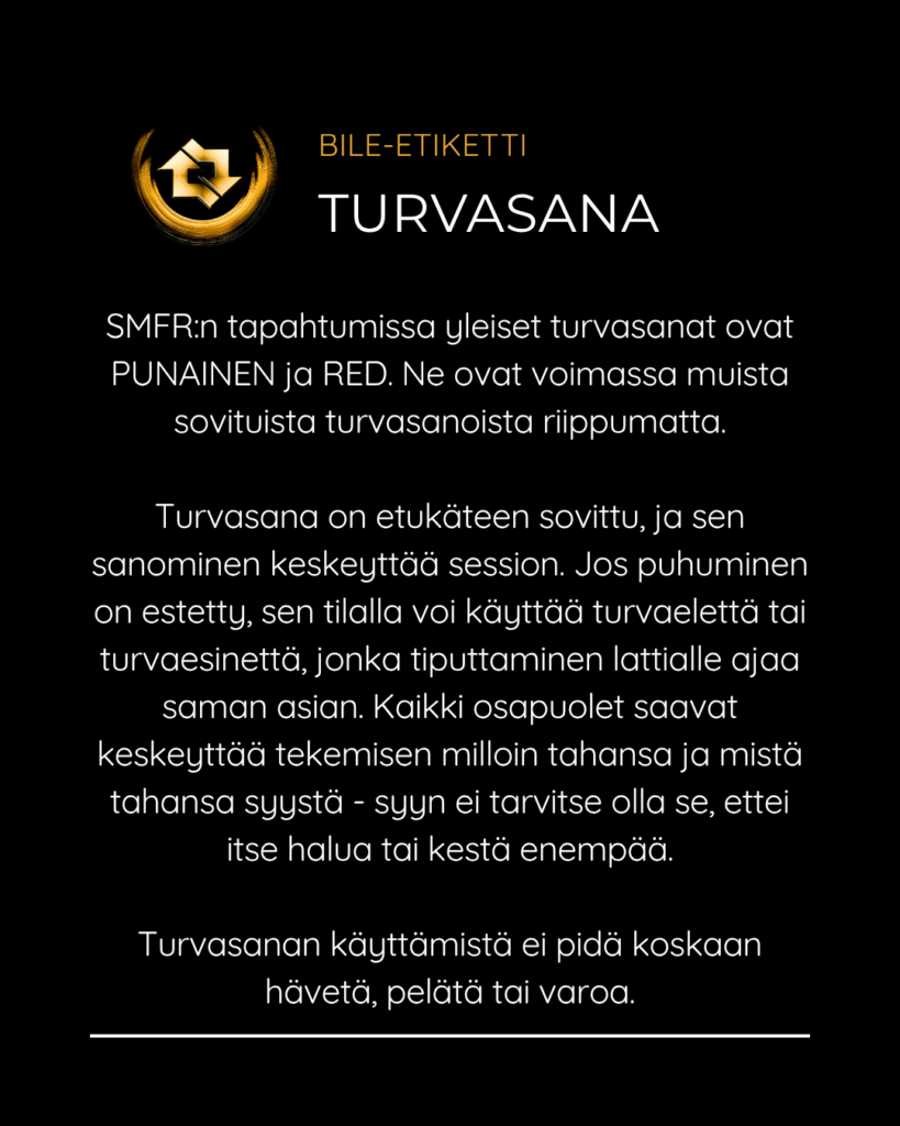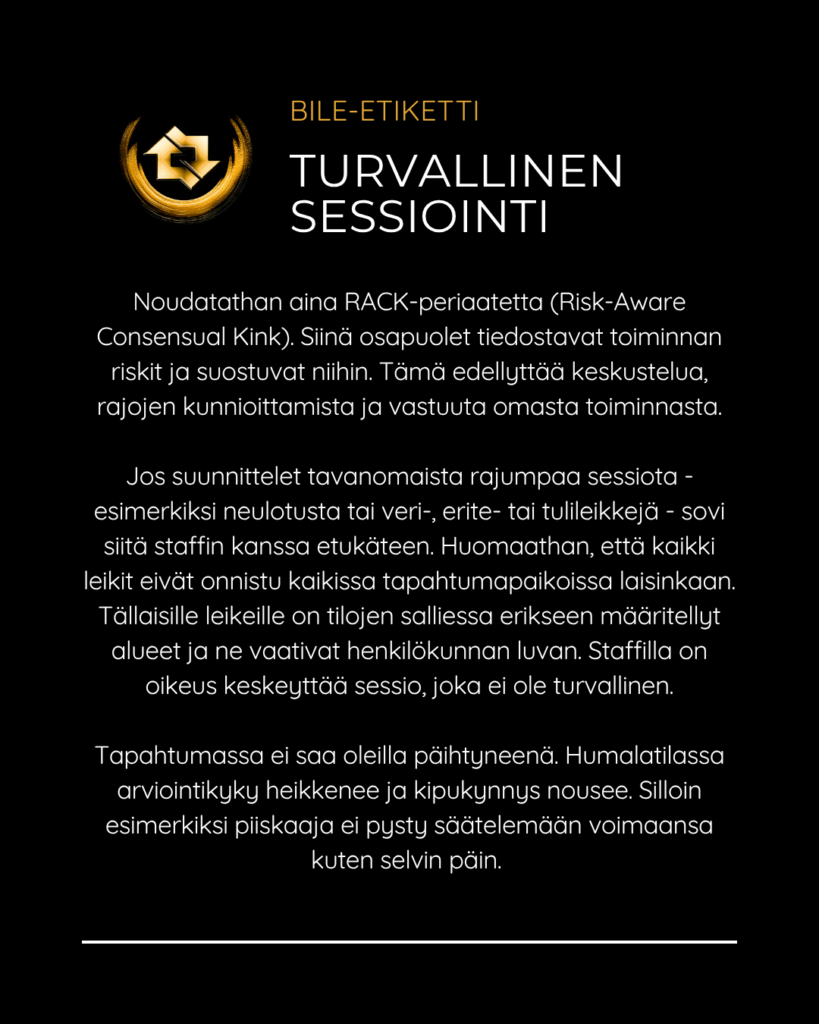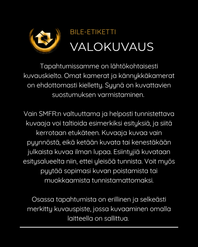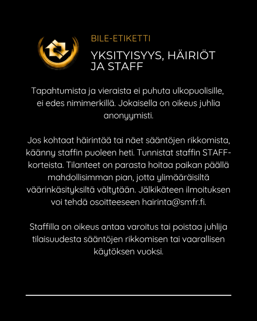 SMFR:n bile-etiketti Posted on April 23, 2026April 23, 2026 SMFR:n tapahtumissa edellytämme että jokainen kävijä noudattaa bile-etikettiä turvallisen ja suvaitsevaisen bile-ympäristön varmistamiseksi. Selaa kuvia ja katso pikaohjeet niin tiedät mitä bileissä saa ja ei saa tehdä. Jaa