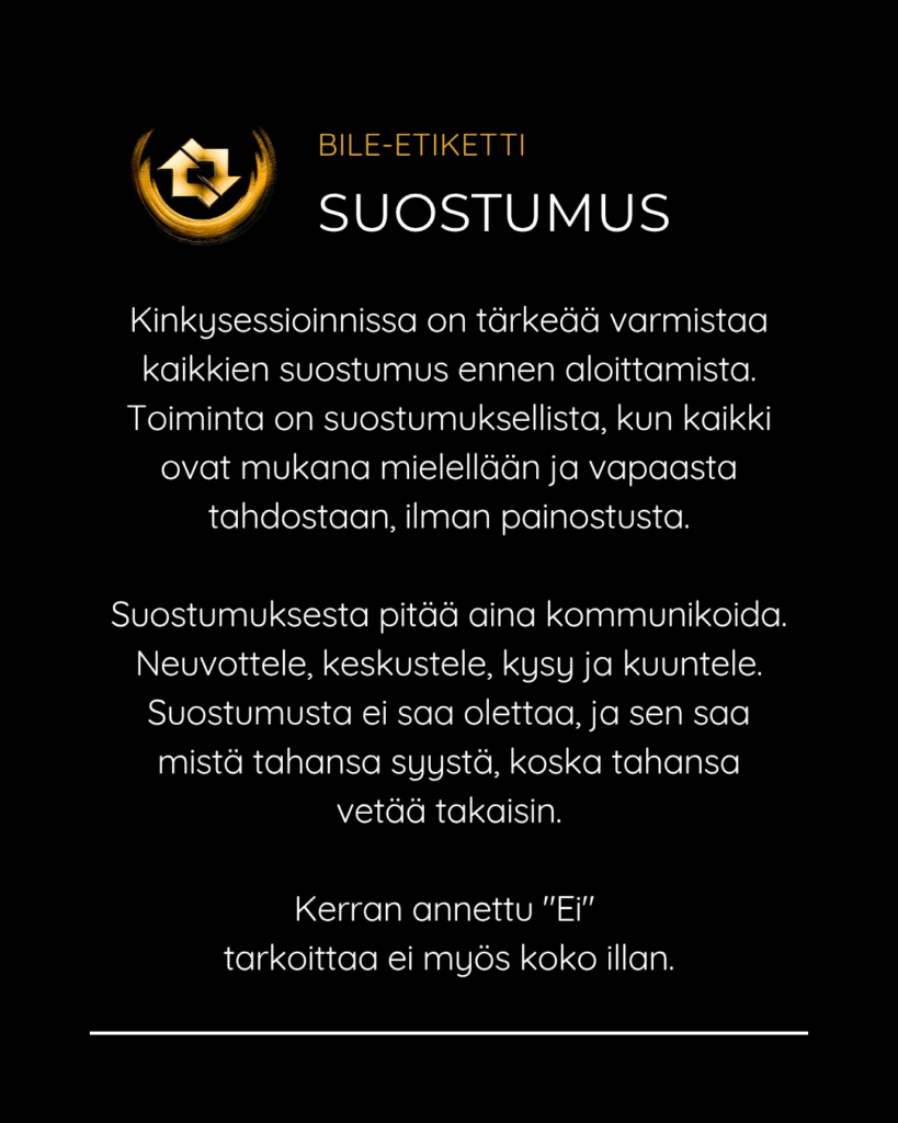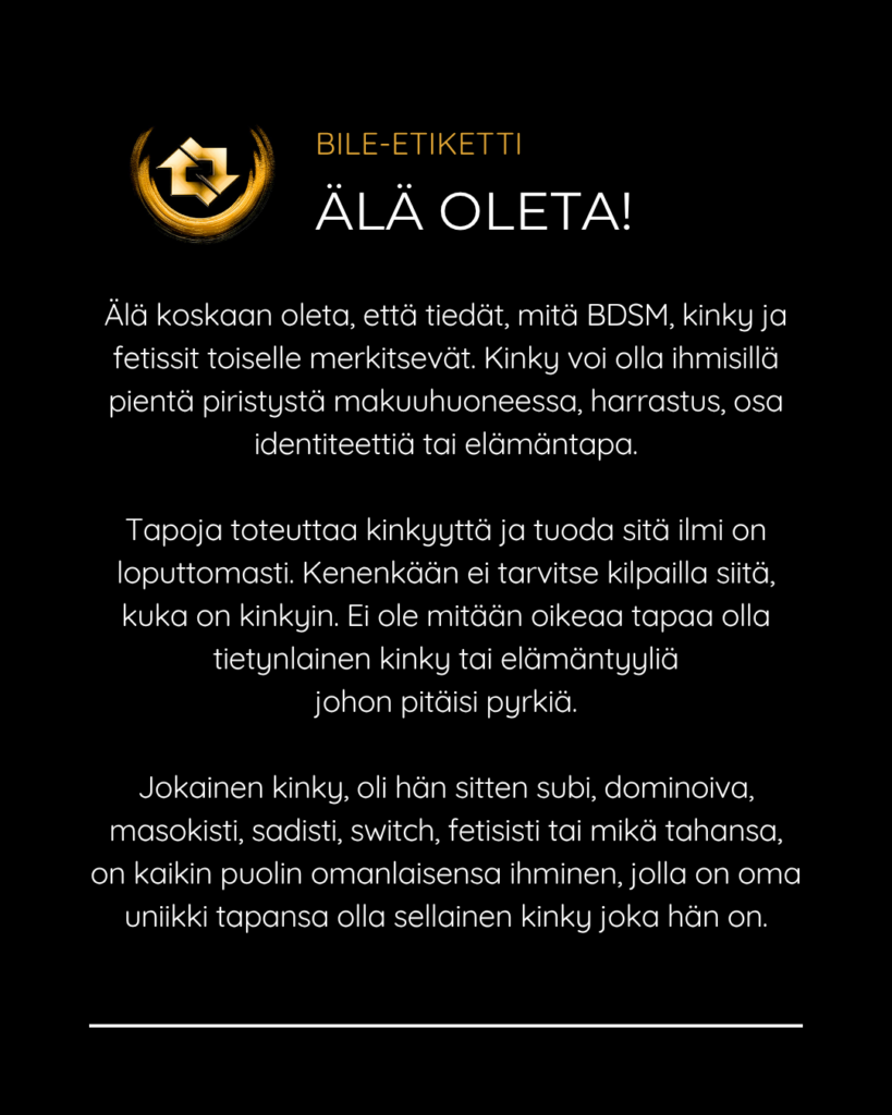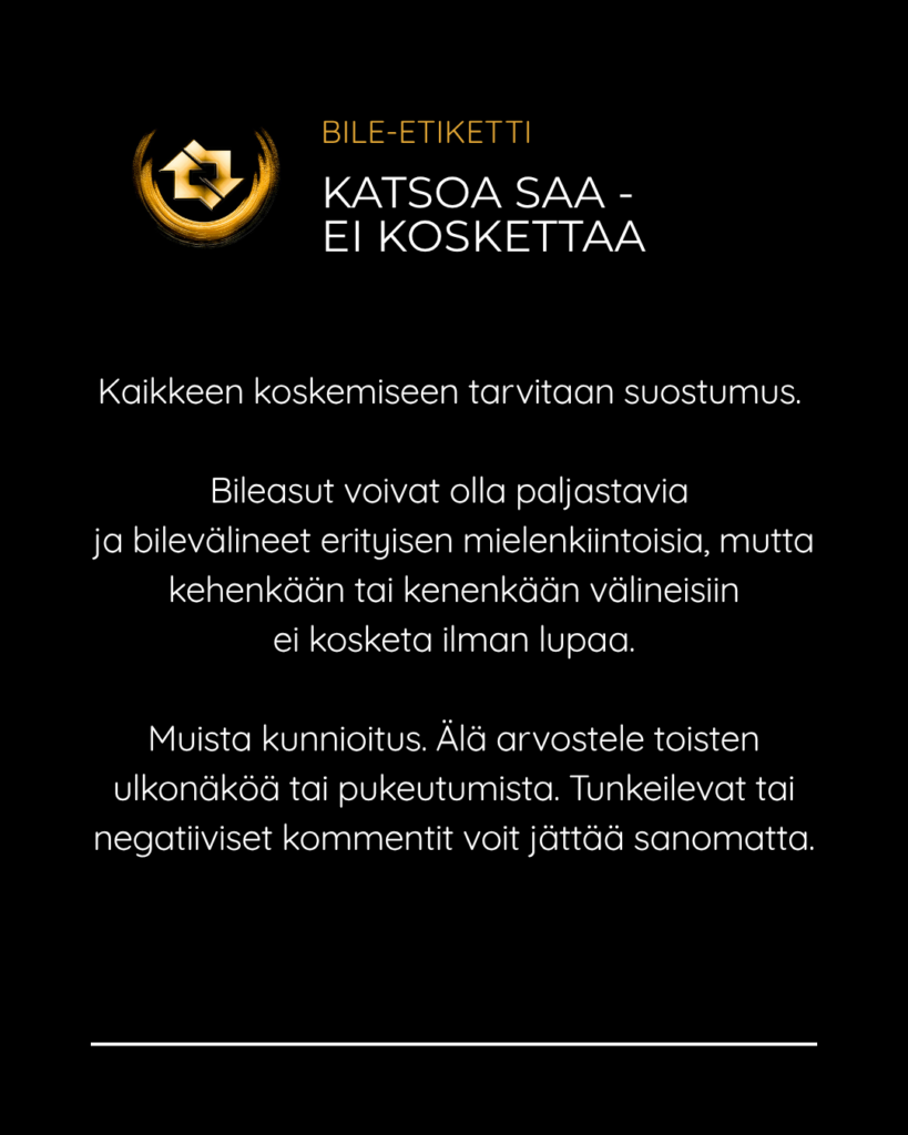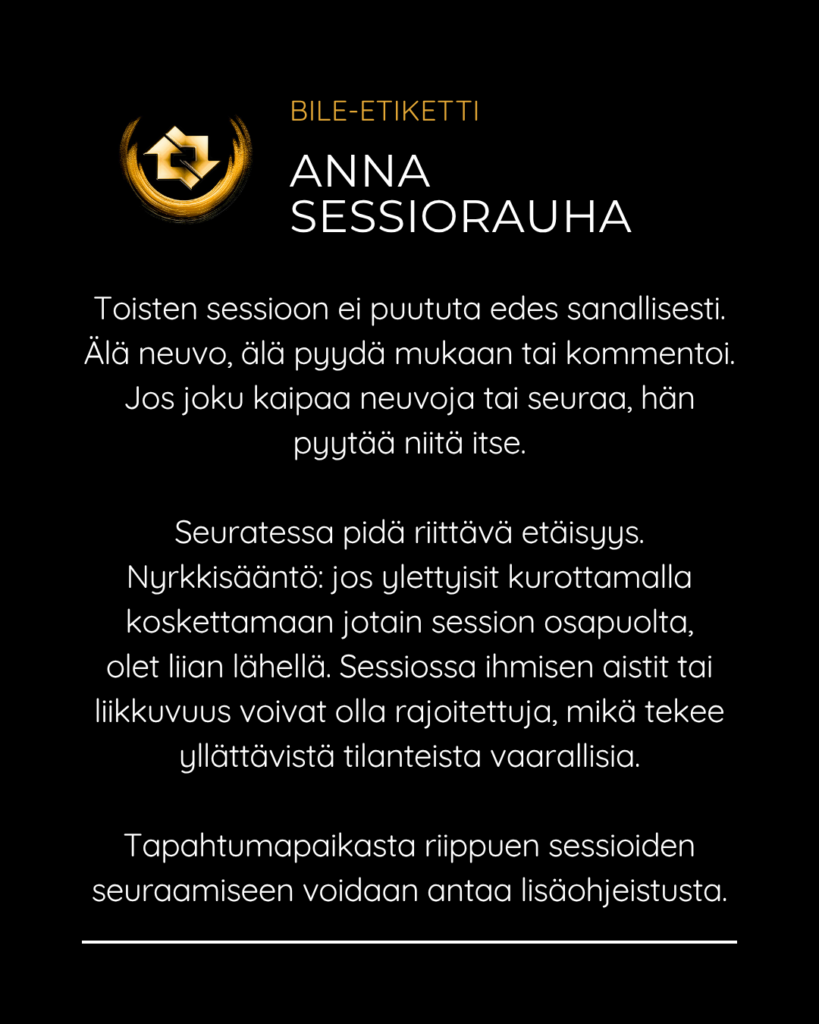 SMFR:n bile-etiketti Posted on April 23, 2026April 23, 2026 SMFR:n tapahtumissa edellytämme että jokainen kävijä noudattaa bile-etikettiä turvallisen ja suvaitsevaisen bile-ympäristön varmistamiseksi. Selaa kuvia ja katso pikaohjeet niin tiedät mitä bileissä saa ja ei saa tehdä. Jaa